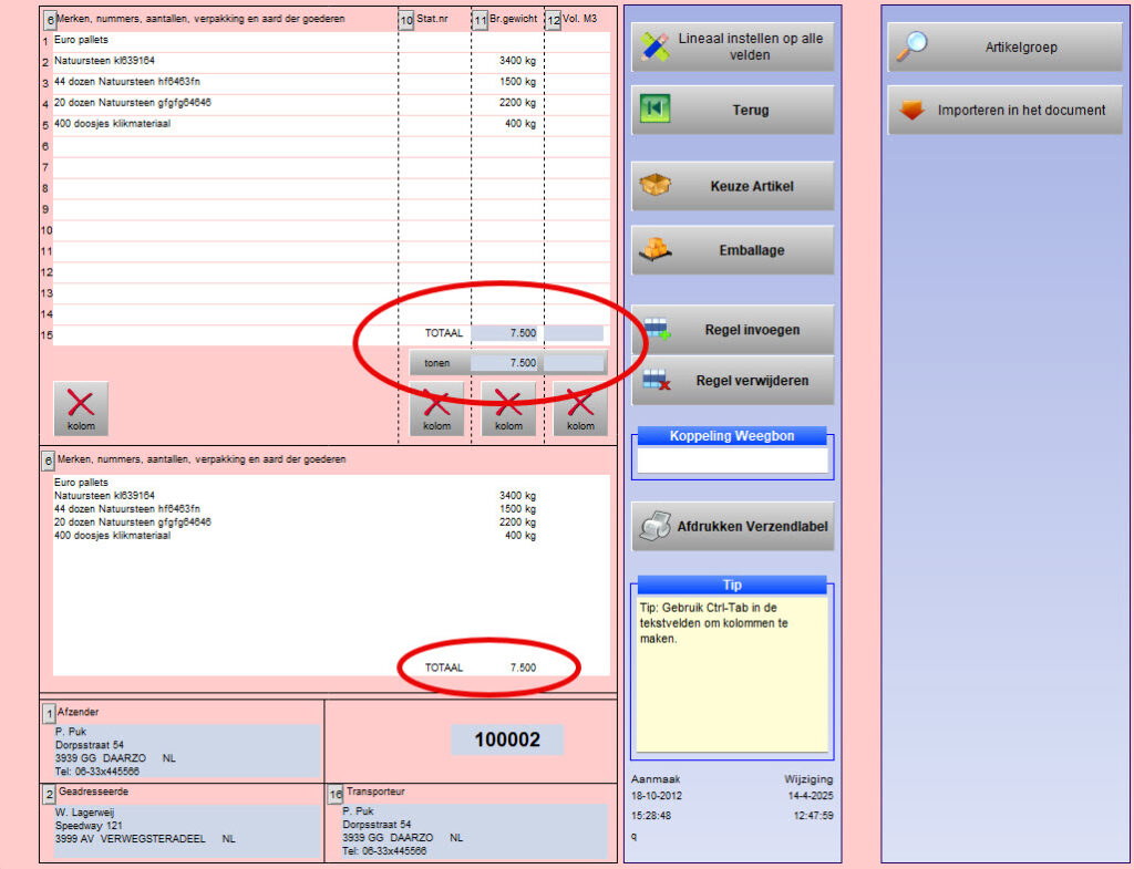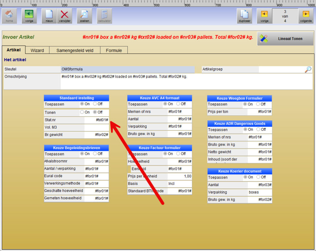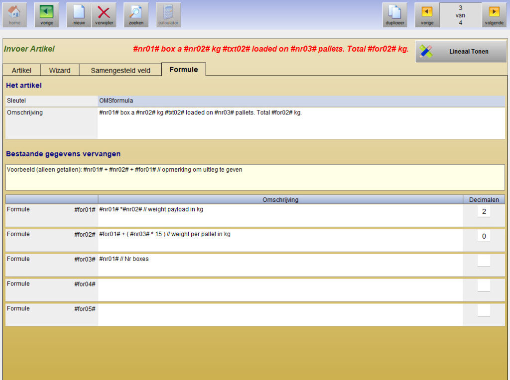 De variabelen en uitkomsten van de formules kunnen vervolgens worden opgenomen in de vaste kolommen en in de omschrijving op de vrachtbrief.
