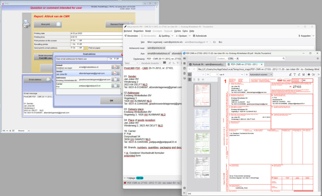 Door PrintCMR wordt een email opgesteld in Outlook, Mozilla Thunderbird of soortgelijke email programmatuur.